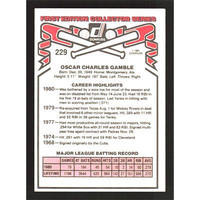 This is a 1981 Donruss Oscar Gamble baseball card. The card is #229 and pictures show condition.