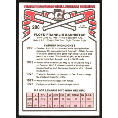 This is a 1981 Donruss Floyd Bannister baseball card. The card is #286 and pictures show condition.