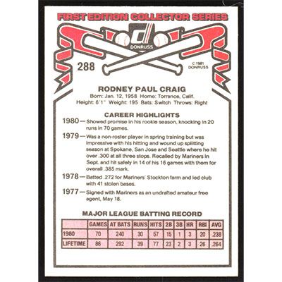 This is a 1981 Donruss Rodney Craig baseball card. The card is #288 and pictures show condition.