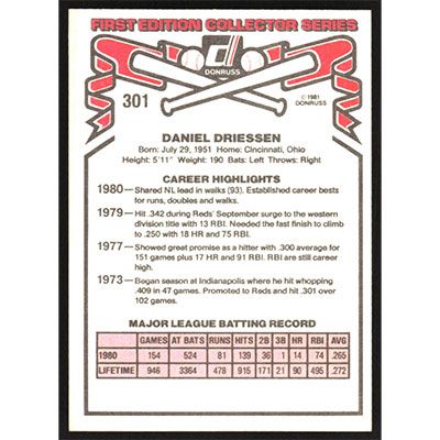 This is a 1981 Donruss Dan Driessen baseball card. The card is #301 and pictures show condition.
