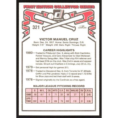 This is a 1981 Donruss Victor Cruz baseball card. The card is #321 and pictures show condition.