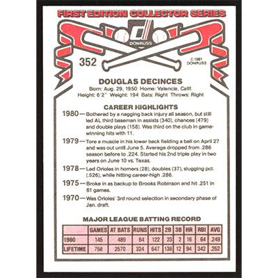 This is a 1981 Donruss Doug DeCinces baseball card. The card is #352 and pictures show condition.