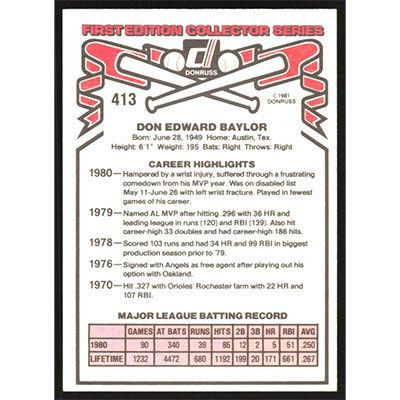 This is a 1981 Donruss Don Baylor baseball card. The card is #413 and pictures show condition.