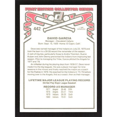 This is a 1981 Donruss Dave Garcia baseball card. The card is #442 and pictures show condition.