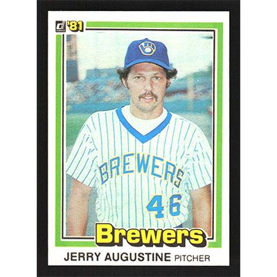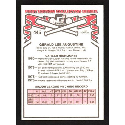 This is a 1981 Donruss Jerry Augustine baseball card. The card is #445 and pictures show condition.
