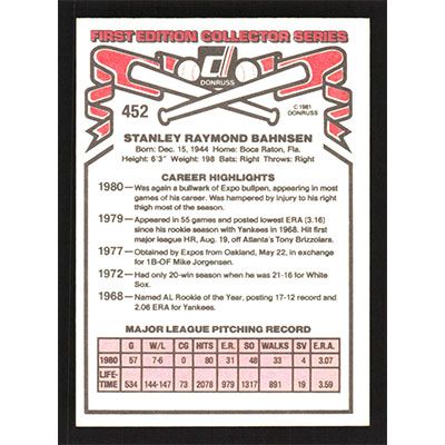 This is a 1981 Donruss Stan Bahnsen baseball card. The card is #452 and pictures show condition.