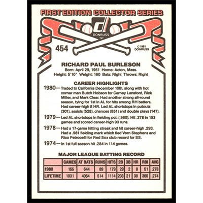 This is a 1981 Donruss Rick Burleson baseball card. The card is #454 and pictures show condition.