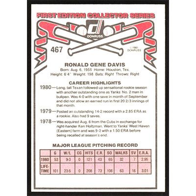 This is a 1981 Donruss Ron Davis baseball card. The card is #467 and pictures show condition.