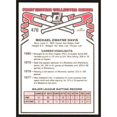 This is a 1981 Donruss Mike Davis baseball card. The card is #470 and pictures show condition.