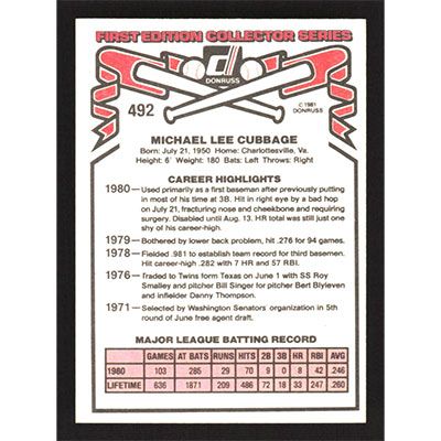 This is a 1981 Donruss Mike Cubbage baseball card. The card is #492 and pictures show condition.