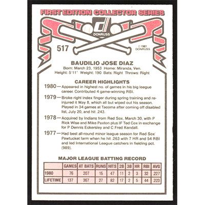 This is a 1981 Donruss Bo Diaz baseball card. The card is #517 and pictures show condition.