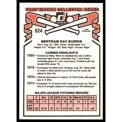 This is a 1981 Donruss Ray Burris baseball card. The card is #524 and pictures show condition.
