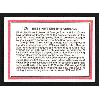 This is a 1981 Donruss George Brett and Rod Carew Best Hitters baseball card. The card is #537 and pictures show condition. Team(s): Kansas City Royals/California Angels
