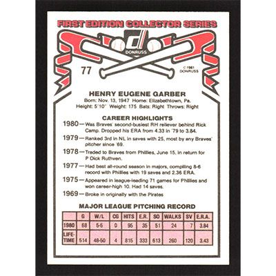This is a 1981 Donruss Gene Garber baseball card. The card is #77 and pictures show condition.