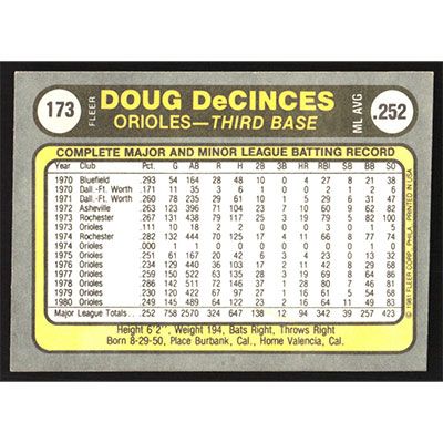 This is a 1981 Fleer Doug DeCinces baseball card. The card is #173 and pictures show condition.