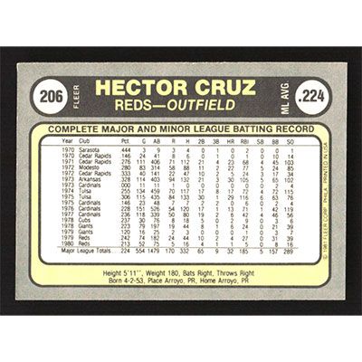 This is a 1981 Fleer Hector Cruz baseball card. The card is #206 and pictures show condition.