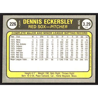 This is a 1981 Fleer Dennis Eckersley baseball card. The card is #226 and pictures show condition.