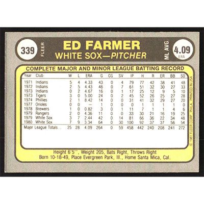 This is a 1981 Fleer Ed Farmer baseball card. The card is #339 and pictures show condition.