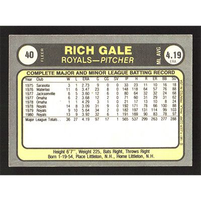 This is a 1981 Fleer Rich Gale baseball card. The card is #40 and pictures show condition.