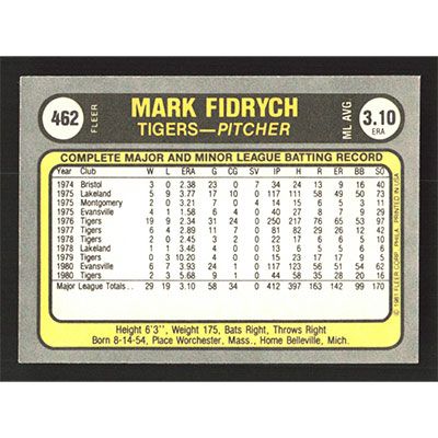 This is a 1981 Fleer Mark Fidrych baseball card. The card is #462 and pictures show condition.