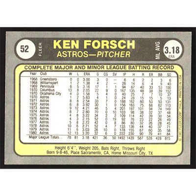 This is a 1981 Fleer Ken Forsch baseball card. The card is #52 and pictures show condition.