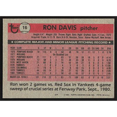 This is a 1981 Topps Ron Davis baseball card. The card is #16 and pictures show condition.