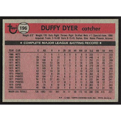 This is a 1981 Topps Duffy Dyer baseball card. The card is #196 and pictures show condition.