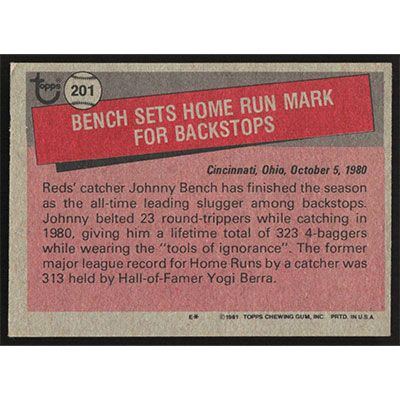 This is a 1981 Topps Johnny Bench Record Breaker baseball card. The card is #201 and pictures show condition.