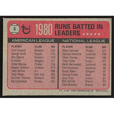 This is a 1981 Topps Cecil Cooper and Mike Schmidt League Leaders baseball card. The card is #3 and pictures show condition. Team(s): Milwaukee Brewers/Philadelphia Phillies