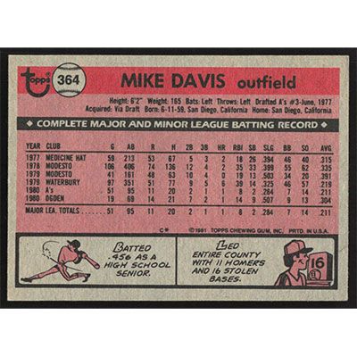 This is a 1981 Topps Mike Davis baseball card. The card is #364 and pictures show condition.