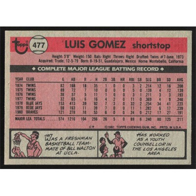 This is a 1981 Topps Luis Gomez baseball card. The card is #477 and pictures show condition.