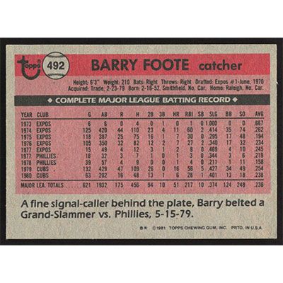 This is a 1981 Topps Barry Foote baseball card. The card is #492 and pictures show condition.