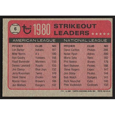 This is a 1981 Topps Len Barker and Steve Carlton Strikeout Leaders baseball card. The card is #6 and pictures show condition. Team(s): Cleveland Indians/Philadelphia Phillies