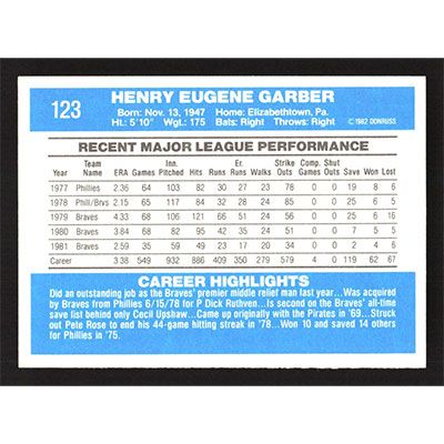 This is a 1982 Donruss Gene Garber baseball card. The card is #123 and pictures show condition.