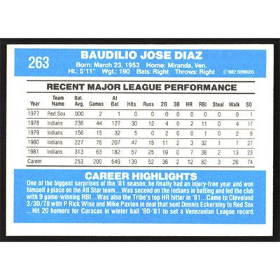 This is a 1982 Donruss Bo Diaz baseball card. The card is #263 and pictures show condition.