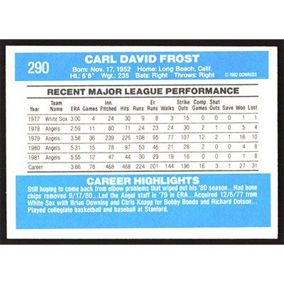 This is a 1982 Donruss Dave Frost baseball card. The card is #290 and pictures show condition.