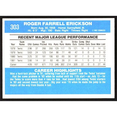 This is a 1982 Donruss Roger Erickson baseball card. The card is #303 and pictures show condition.