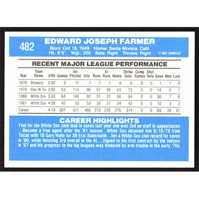 This is a 1982 Donruss Ed Farmer baseball card. The card is #482 and pictures show condition.