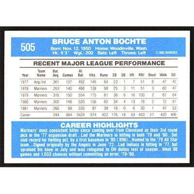 This is a 1982 Donruss Bruce Bochte baseball card. The card is #505 and pictures show condition.