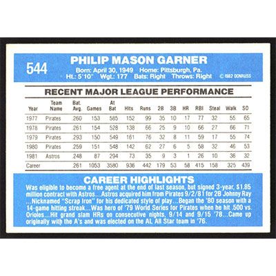 This is a 1982 Donruss Phil Garner Error - Reverse Negative baseball card. The card is #544 and pictures show condition.