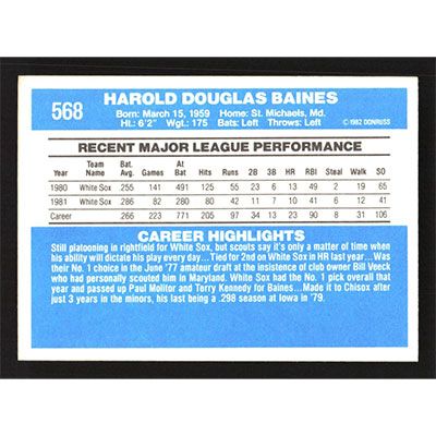This is a 1982 Donruss Harold Baines baseball card. The card is #568 and pictures show condition.