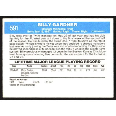 This is a 1982 Donruss Billy Gardner baseball card. The card is #591 and pictures show condition.