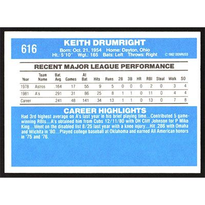 This is a 1982 Donruss Keith Drumright baseball card. The card is #616 and pictures show condition.