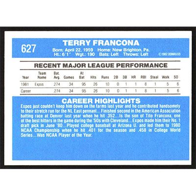 This is a 1982 Donruss Terry Francona baseball card. The card is #627 and pictures show condition.