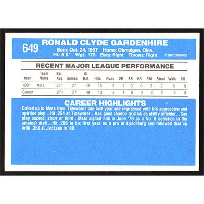 This is a 1982 Donruss Ron Gardenhire baseball card. The card is #649 and pictures show condition.
