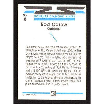 This is a 1982 Donruss Rod Carew Diamond Kings baseball card. The card is #8 and pictures show condition.