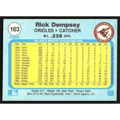 This is a 1982 Fleer Rick Dempsey baseball card. The card is #163 and pictures show condition.