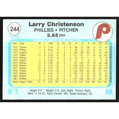 This is a 1982 Fleer Larry Christenson baseball card. The card is #244 and pictures show condition.