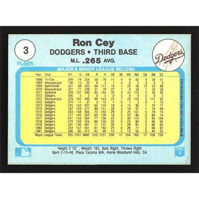 This is a 1982 Fleer Ron Cey baseball card. The card is #3 and pictures show condition.