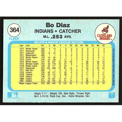 This is a 1982 Fleer Bo Diaz baseball card. The card is #364 and pictures show condition.